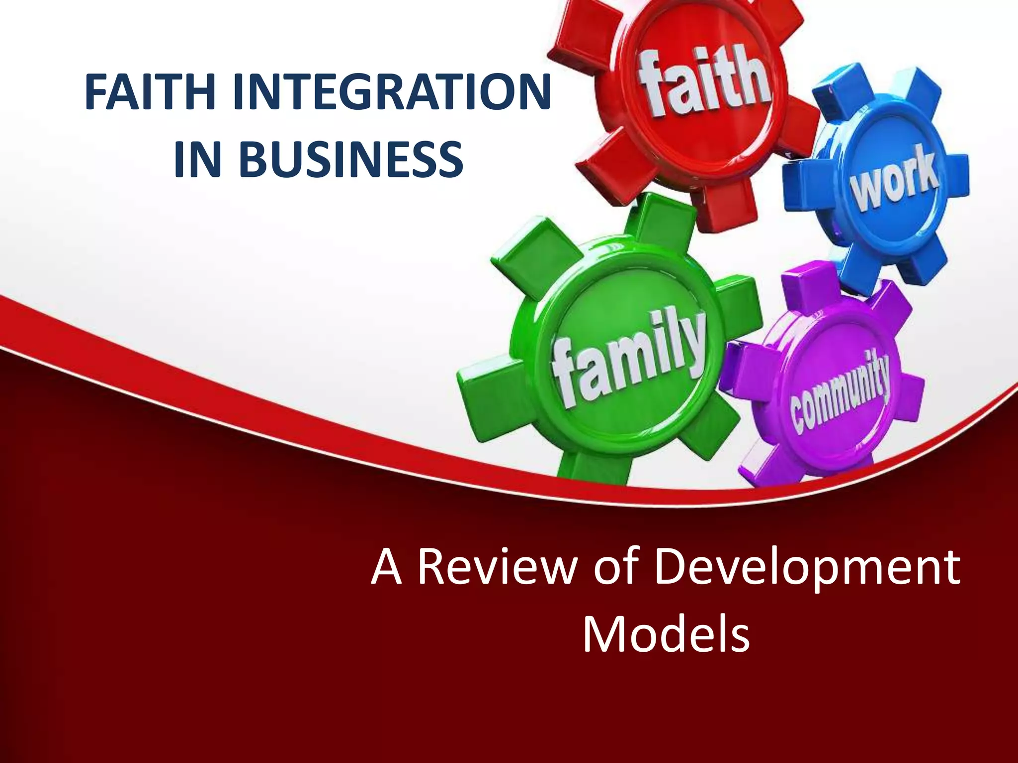 The document discusses several models for conceptualizing the development of faith integration in business. It describes a cycle with six stages - from an emerging awareness to a fully embodied stage where faith infuses all aspects of life. It also outlines four quadrants that track growth from an isolated view of faith and work to a fully integrated perspective. Additionally, it presents five levels of faith integration - from practices to underlying presuppositions. Finally, it discusses four perspectives on work and four stages of Christian growth from simplicity to humility.
