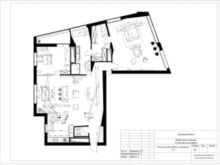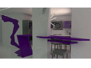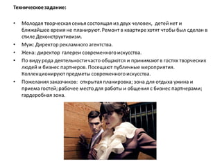 Документ представляет собой дизайн проект квартиры в стиле деконструктивизма, включающий визуализацию таких помещений, как кухня, кабинет, спальня, основной и гостевой санузлы. Он детализирует элементы стиля и функциональные зоны квартиры. Проект демонстрирует уникальный подход к распределению пространства в интерьере.