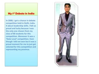 1) In 2008, the author was selected to represent their school in a state-level debate competition in Delhi, India, feeling proud to be the only one of 80 students chosen.