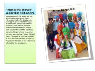 2) Also in 2008, the author and their bhangra dance group were selected to perform in the opening ceremony of the Olympics in Beijing, China, representing Punjabi culture.