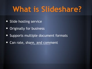 Slideshare is an online slide hosting and presentation platform that allows users to upload PowerPoint presentations, PDFs, and other file formats for sharing. It functions similarly to YouTube but for slide presentations. Users can view presentations, rate them, comment, and share them on social networks like LinkedIn and Facebook. Notable users include government agencies and large companies who use Slideshare to publicly share information.