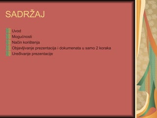 Slideshare je online servis za dijeljenje prezentacija i dokumenata koji omogućuje jednostavno objavljivanje datoteka u dva koraka. Korisnici mogu uređivati prezentacije, povezivati ih s društvenim mrežama i umetati ih na blogove. Usluga je besplatna i zahtijeva internetsku vezu i preglednik.