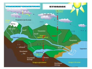 Hydrology is the science of water on Earth. It studies the occurrence, circulation, and distribution of water, including precipitation, evaporation, soil moisture, groundwater, runoff, and flooding. There are two main types - scientific hydrology which studies physical processes, and engineering hydrology which applies scientific principles to water resources. The hydrologic cycle describes the continuous movement of water on, above, and below the surface of the Earth, including storage and transport through different physical states driven by energy from the sun.