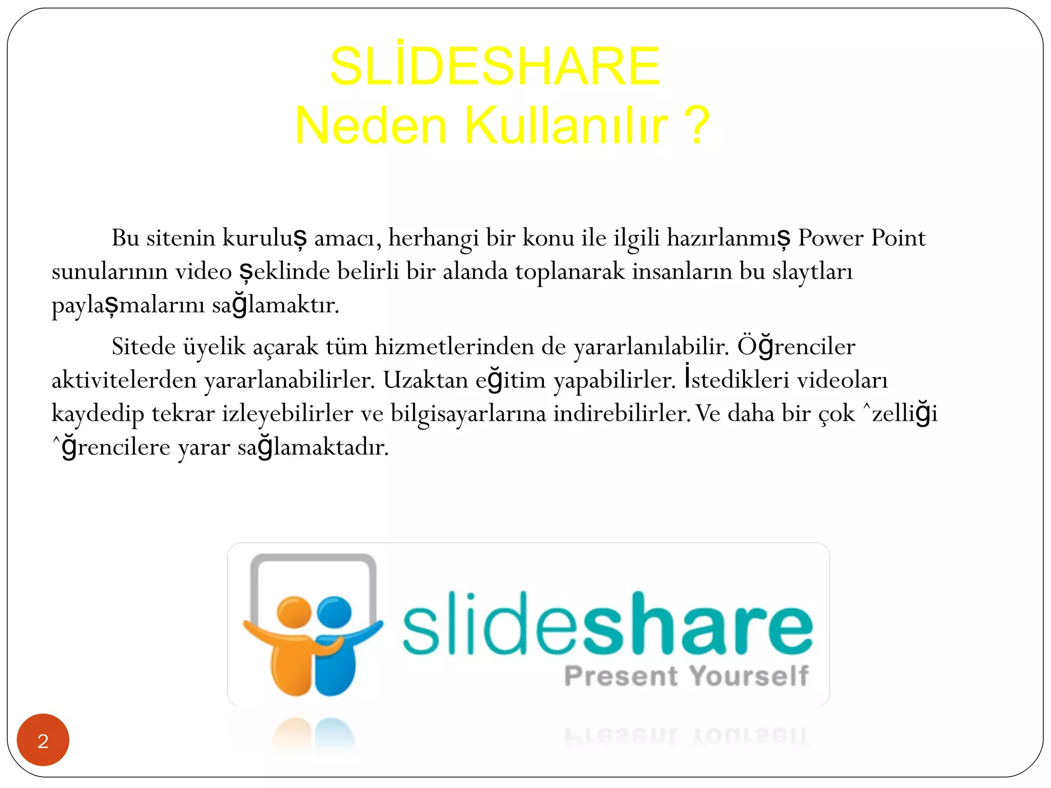 SLİDESHARE NedenKullanılır ? Bu sitenin kuruluş amacı, herhangi bir konu ile ilgili hazırlanmış Power Point sunularının video şeklinde belirli bir alanda toplanarak insanların bu slaytları paylaşmalarını sağlamaktır. Sitede üyelik açarak tüm hizmetlerinden de yararlanılabilir. Öğrenciler aktivitelerden yararlanabilirler. Uzaktan eğitim yapabilirler. İstedikleri videoları kaydedip tekrar izleyebilirler ve bilgisayarlarına indirebilirler. Ve daha bir çok özelliği öğrencilere yarar sağlamaktadır.