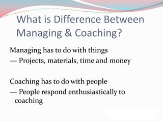 Coaching involves guiding people to achieve goals by discovering their strengths and weaknesses and providing resources and advice. An effective coach objectively assesses a person's current performance, sets measurable goals with them, develops a plan to achieve those goals through training and development activities, implements the plan, evaluates performance, and provides feedback focused on continuous improvement. When coaching unmotivated employees, know-it-alls, or those who feel they have more experience ("BALTY"), the coach should focus on aligning individual and team goals, ask questions to address issues directly, clearly communicate appreciation, and leverage the person's expertise.