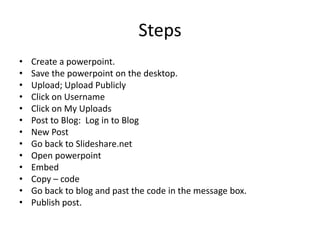 The document provides steps to create and share a PowerPoint presentation online. It instructs the user to create a PowerPoint, save it to their desktop, and upload it publicly to Slideshare.net. It then guides them through logging into their blog, creating a new post, copying the embed code from the uploaded presentation on Slideshare, and pasting that code into the blog post to share it.