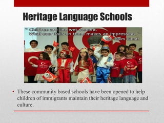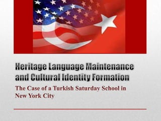 This document discusses the role of a Turkish Saturday school in New York City in maintaining the Turkish language and culture among children of Turkish immigrants. The school serves children ages 4-14 from October to June, where they recite a pledge of allegiance in Turkish and follow a content-based curriculum while their parents socialize. A study of the school concluded that it helps children connect to their heritage and family abroad, builds their confidence, and teaches them that cultural diversity is positive.