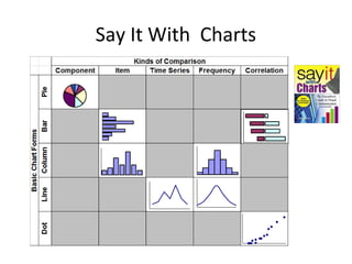 The document discusses the effectiveness of using charts to present statistical data to non-statisticians, emphasizing that visual representation can convey information efficiently. It highlights concepts such as statistical process control (SPC), variation types, and the importance of clarity in graphical presentations. Additionally, it offers resources for further exploration of visual methods and statistical analysis tools.