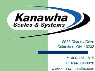 The document discusses several products from Kanawha Scales including dimensioning scales, forklift scales, floor scales, indicators, and rental options. The Hawkeye 1200C dimensioning scale and Perfect Measure software allow users to calculate shipping costs based on package size and volume. The CLS forklift scale integrates weighing into cargo transfer to save time and space. The KS540 floor scale is durable with a protective frame and conduit for components.
