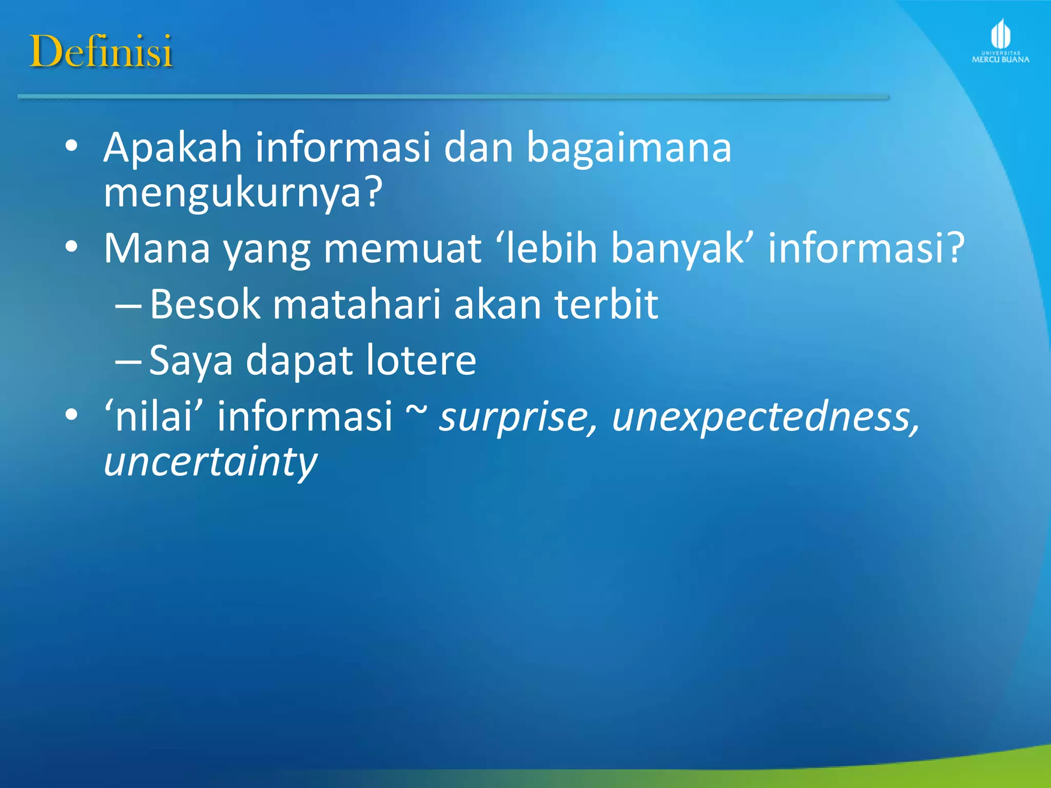 Modul ini membahas tentang definisi informasi dan cara mengukurnya berdasarkan teori informasi Claude Shannon. Informasi didefinisikan sebagai data yang telah diolah menjadi bentuk yang berarti bagi penerimanya. Nilai informasi diukur dalam bit yang bergantung pada kemungkinan terjadinya suatu simbol. Kapasitas saluran ditentukan oleh bandwidth dan rasio signal terhadap noise, sesuai rumus C = B log2(1+S/N).