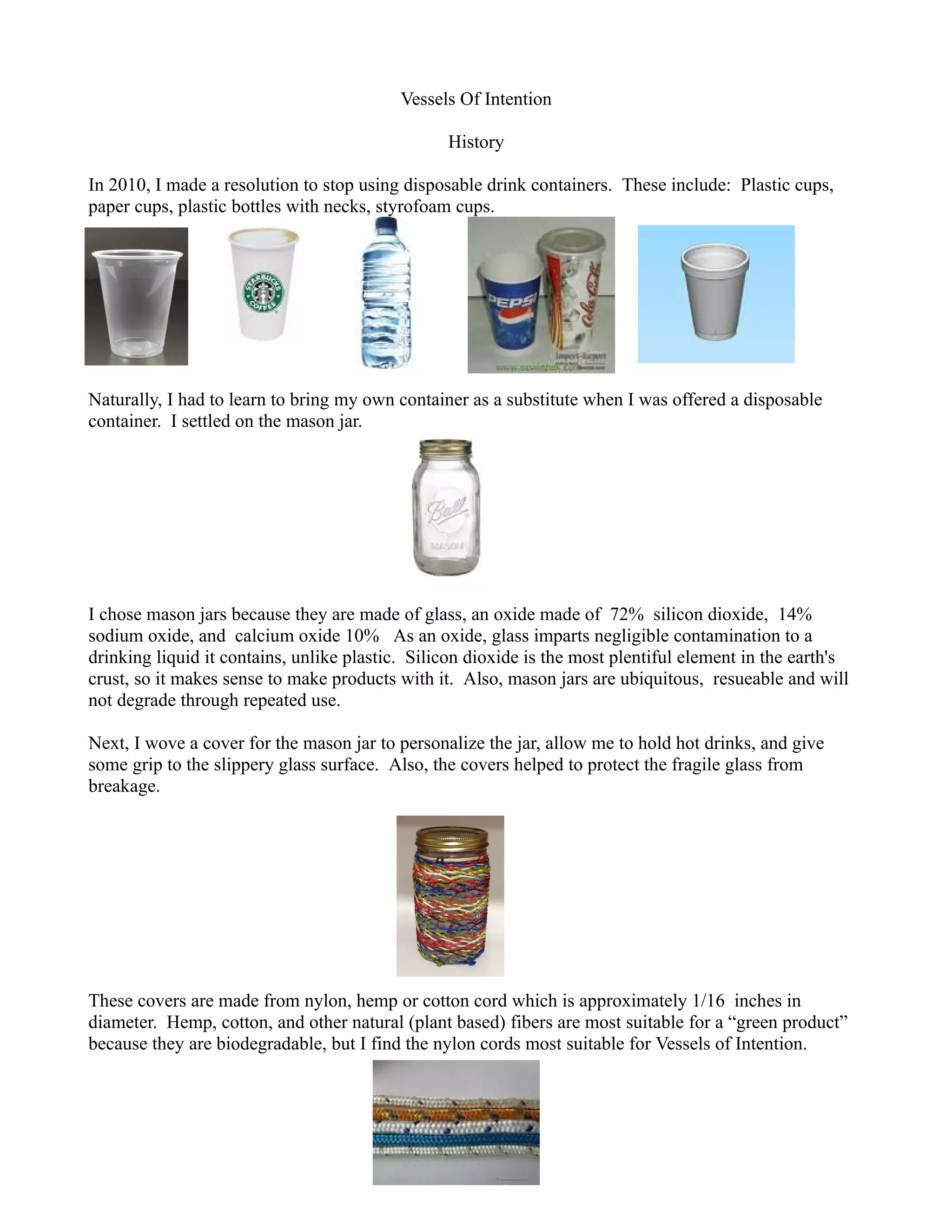 The document discusses the history and development of "Vessels of Intention", reusable drink containers made from mason jars with woven cord covers. Key points: