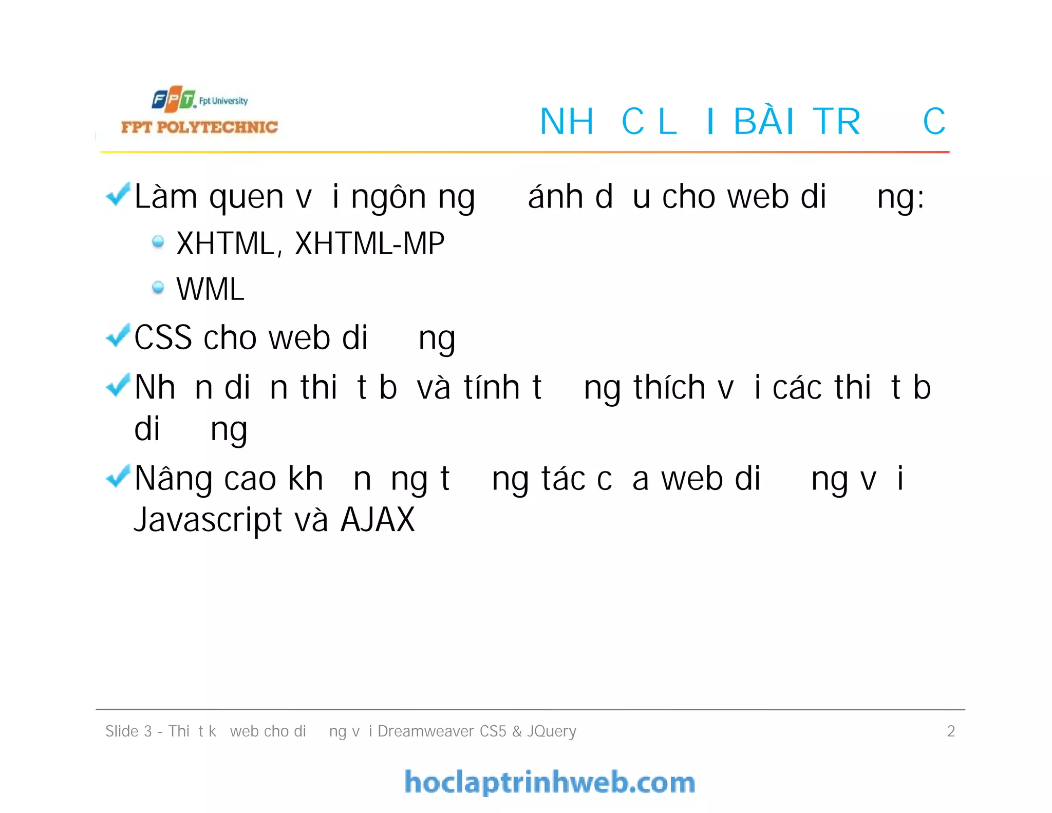 Tài liệu hướng dẫn thiết kế web cho di động bằng Dreamweaver CS5 và jQuery, bao gồm các khái niệm về nhận diện thiết bị, tương thích và tương tác với JavaScript và AJAX. Nó cung cấp chi tiết về việc cấu hình và sử dụng cơ sở dữ liệu thiết bị WURFL và DeviceAtlas để nhận diện thiết bị di động, cùng với các nguyên tắc lập trình. Cuối cùng, tài liệu trình bày cách tích hợp JavaScript và AJAX nhằm nâng cao tính năng và trải nghiệm người dùng trên web di động.