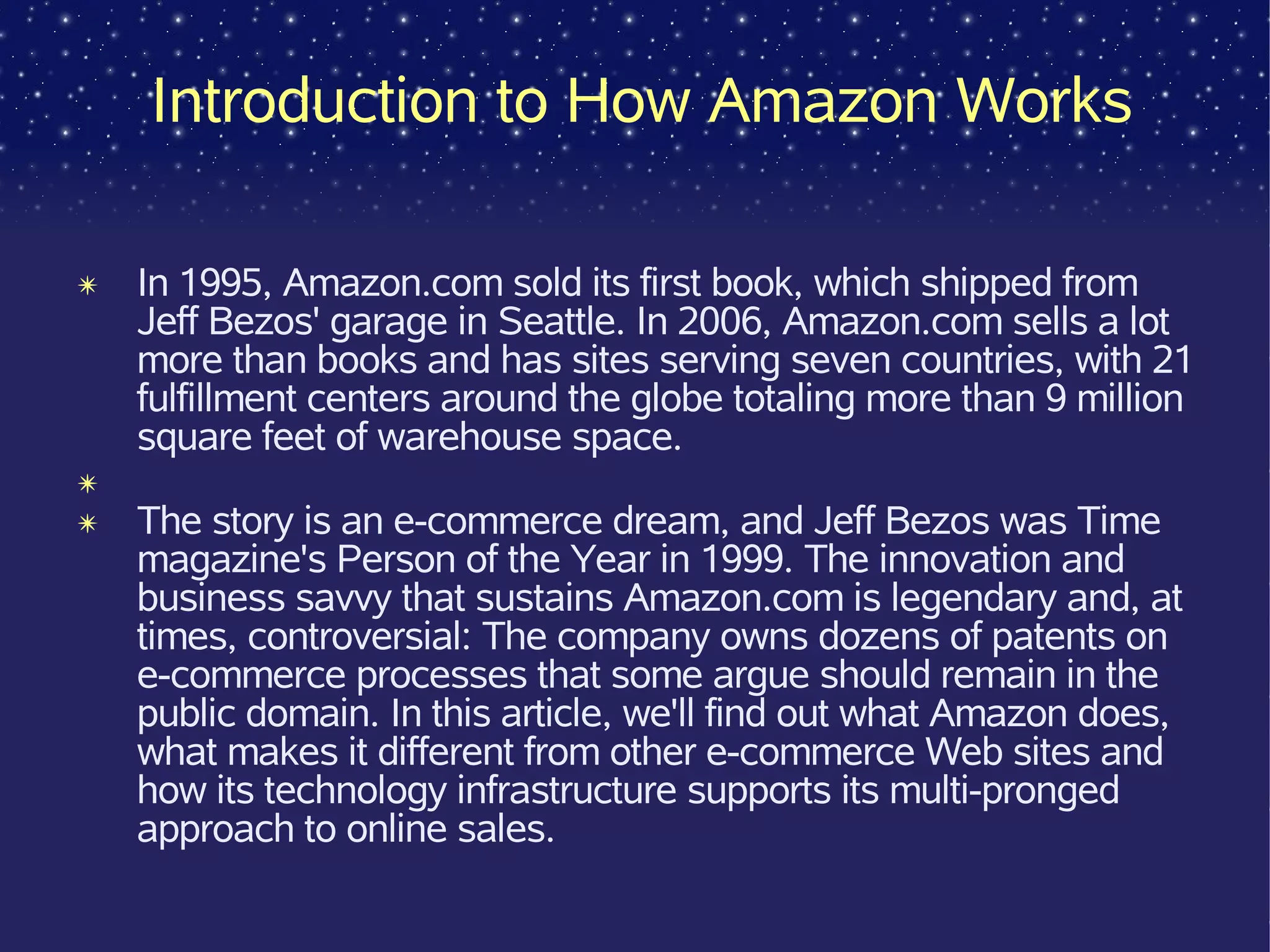 Amazon began as an online bookseller in 1995 and has since expanded into multiple product categories. It utilizes a massive Linux-based technology infrastructure and owns warehouses around the world to fulfill orders directly. Amazon also allows third-party sellers to use its platform and offers associates and developers tools to integrate with and leverage its e-commerce functionality and drive sales.