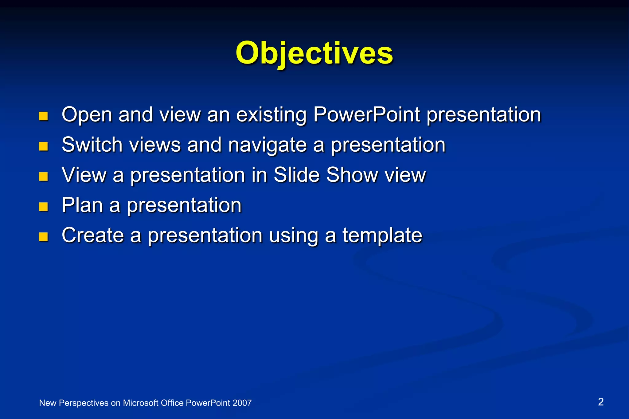 2. It describes how to open an existing presentation, switch between views, plan a presentation, use templates to create slides, add and modify text, and check for spelling errors.