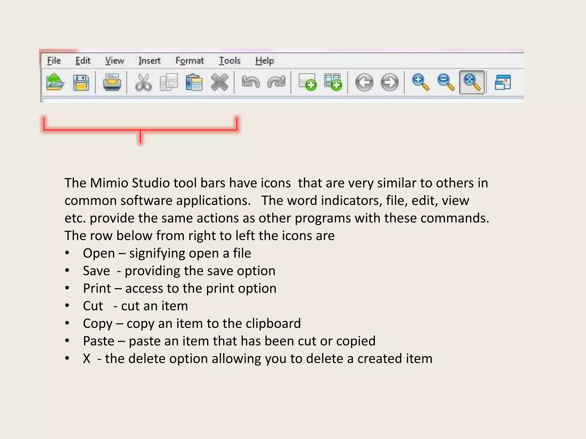 This document serves as a beginner's guide to identifying the basic icons in Mimio Studio software, highlighting similarities with common software applications. It provides an overview of the main toolbars, including icons for file management, editing, and creating activities, while emphasizing the customizable options available for shapes, colors, and content access. The guide also mentions that more specialized icons and functionalities will be explored in future segments.