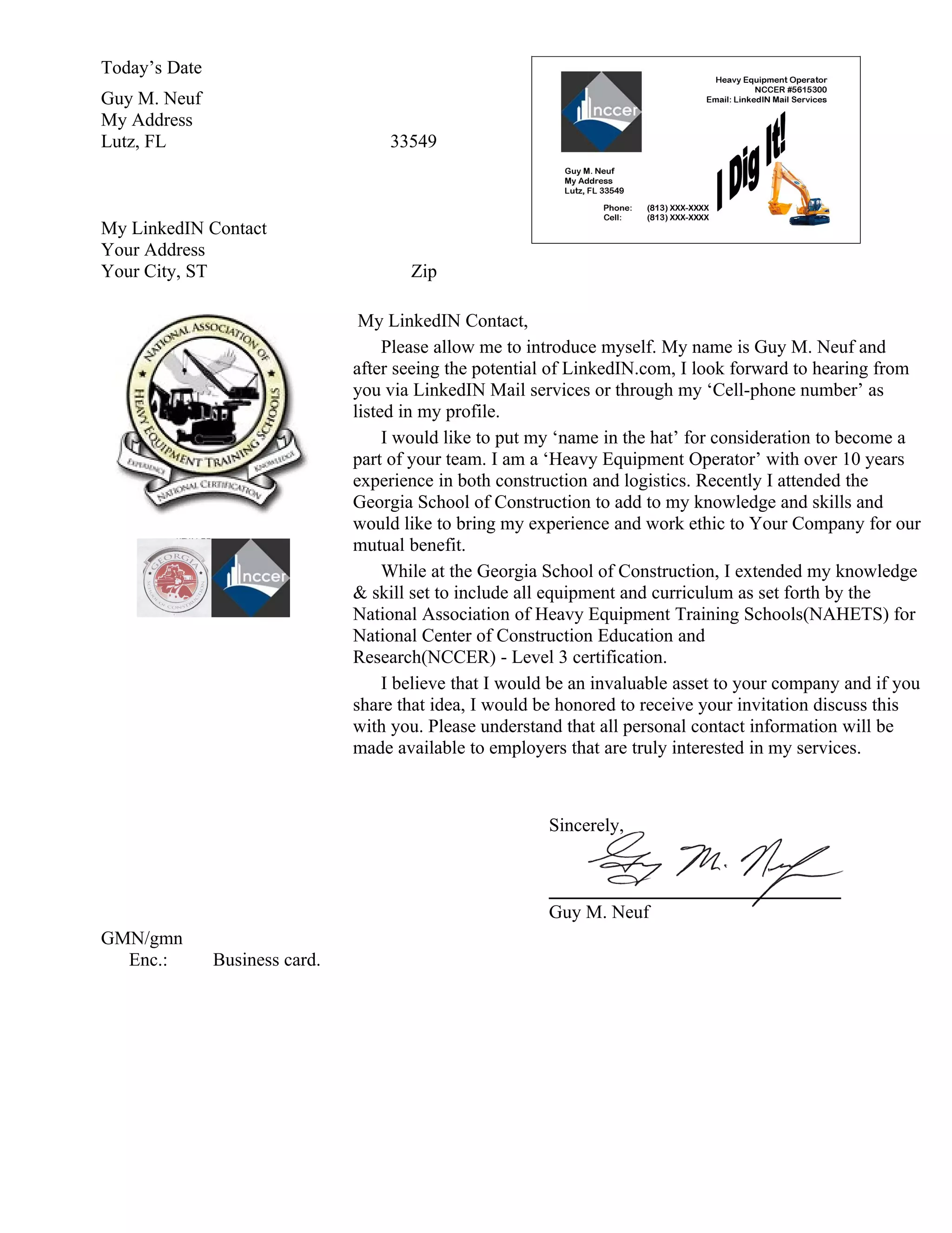 The document is a cover letter from Guy M. Neuf introducing himself as a heavy equipment operator with over 10 years of experience. He attended the Georgia School of Construction to expand his skills and is seeking a position with the recipient's company where he can utilize his experience and work ethic. He provides his contact information and resume for consideration.
