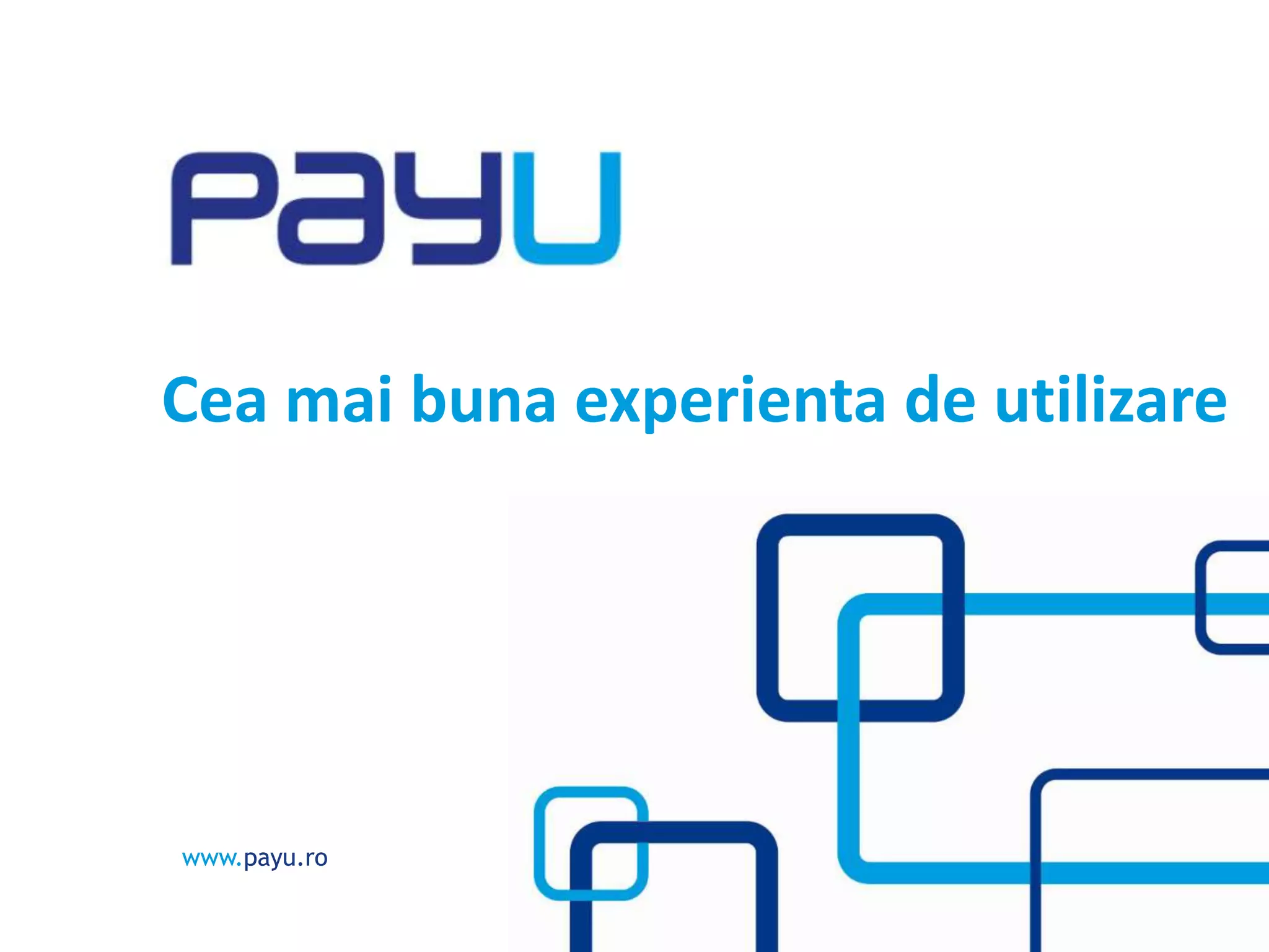 PayU oferă o experiență de utilizare mobile-friendly printr-un panou de control intuitiv și personalizabil, cu funcții de procesare multi-limbă și multi-valută. Compania dispune de instrumente pentru creșterea conversiei și a încrederii clienților, precum feedback-ul de la clienți și suport antifraudă 24/7. Cu peste 25.000 de clienți și parteneriate cu mai mult de 50 de bănci, PayU are o experiență internțională vastă în domeniul comerțului electronic.