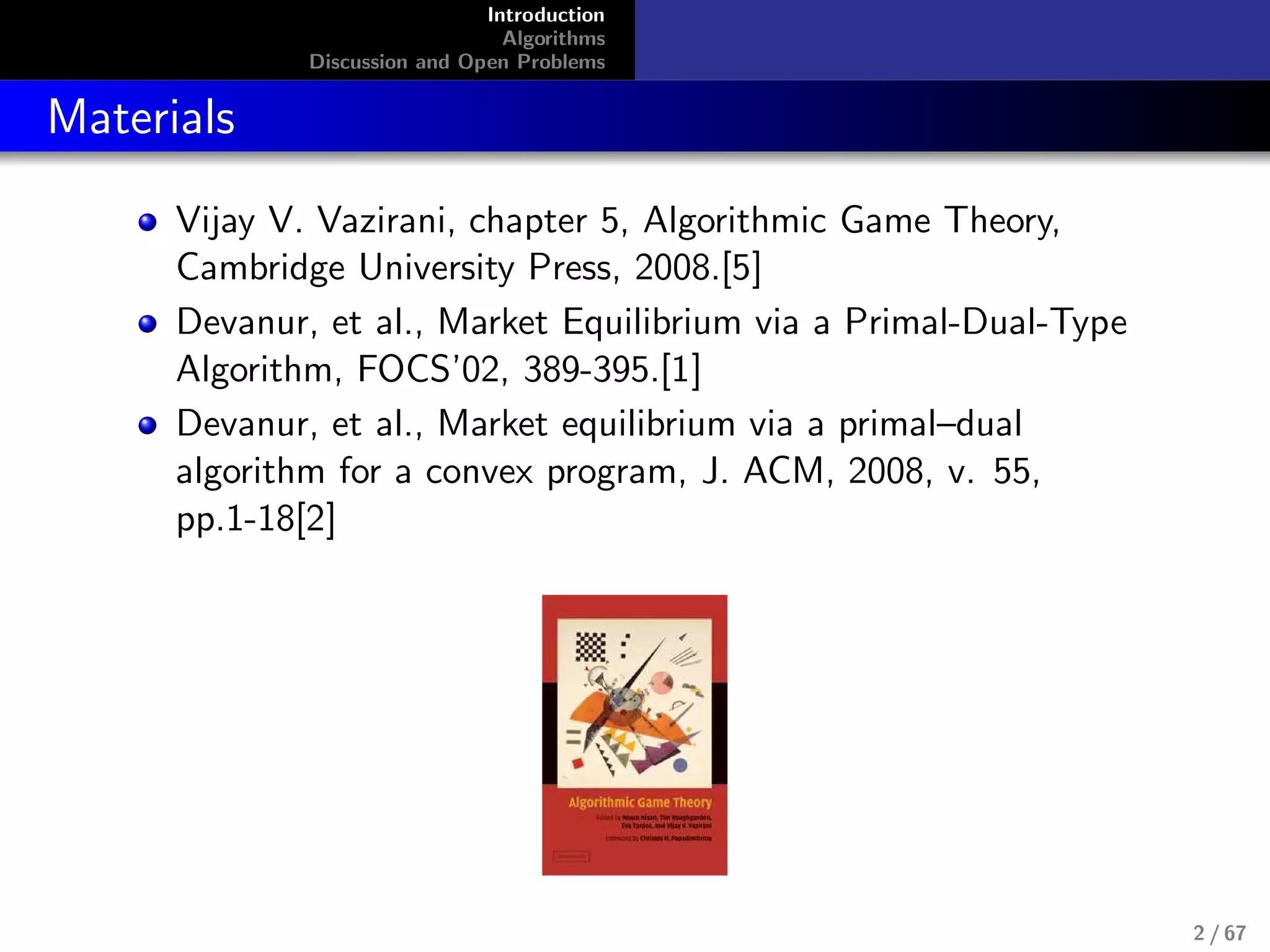 The document discusses algorithms for computing market equilibria in economic models. It introduces Fisher's model and the Arrow-Debreu model of markets. It describes how competitive equilibria and Pareto efficiency arise in these models under certain assumptions. The document then presents an algorithm based on a primal-dual approach that computes market clearing prices for Fisher's linear model in polynomial time by incrementally raising prices until surplus is eliminated.