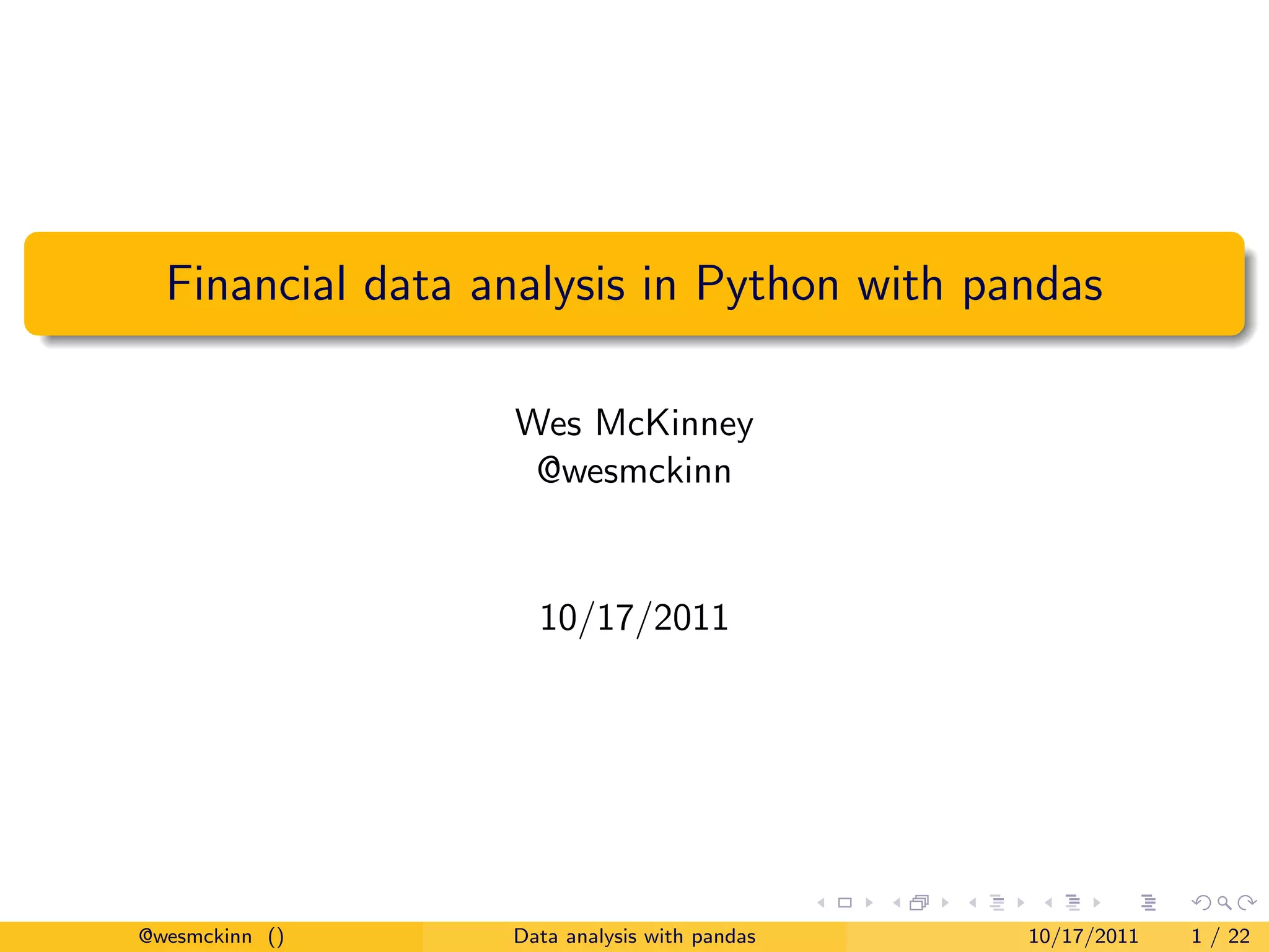 This document discusses using Python and the pandas library for financial data analysis. It provides an overview of pandas, describing it as providing rich data structures like DataFrame for working with financial time series and panel data. It highlights pandas' features for fast data alignment, time series functionality, and SQL-like operations which make it well-suited for financial analysis tasks. The document also presents pandas as addressing weaknesses that Python previously had for statistical analysis and filling gaps relative to data analysis tools like R.