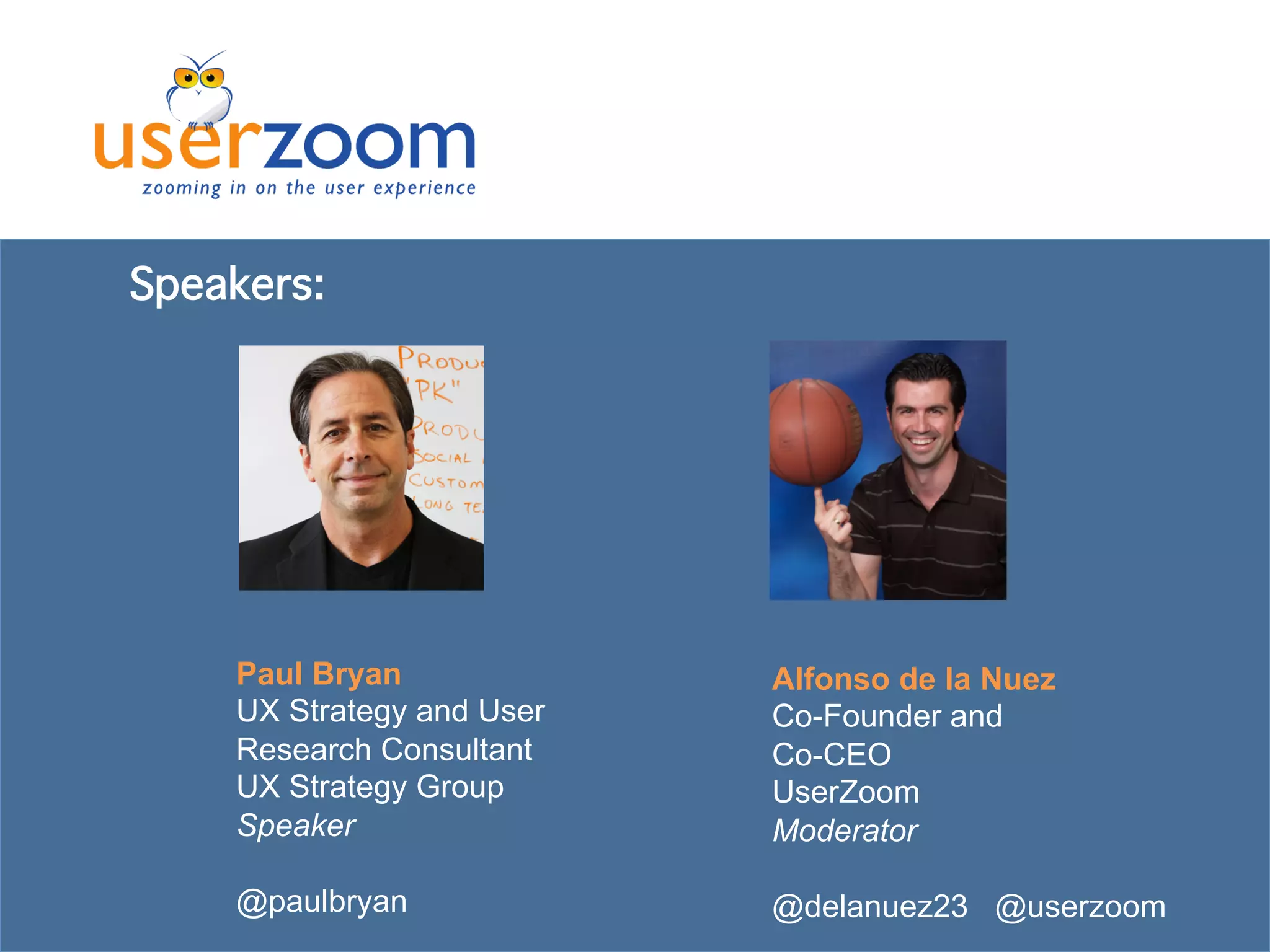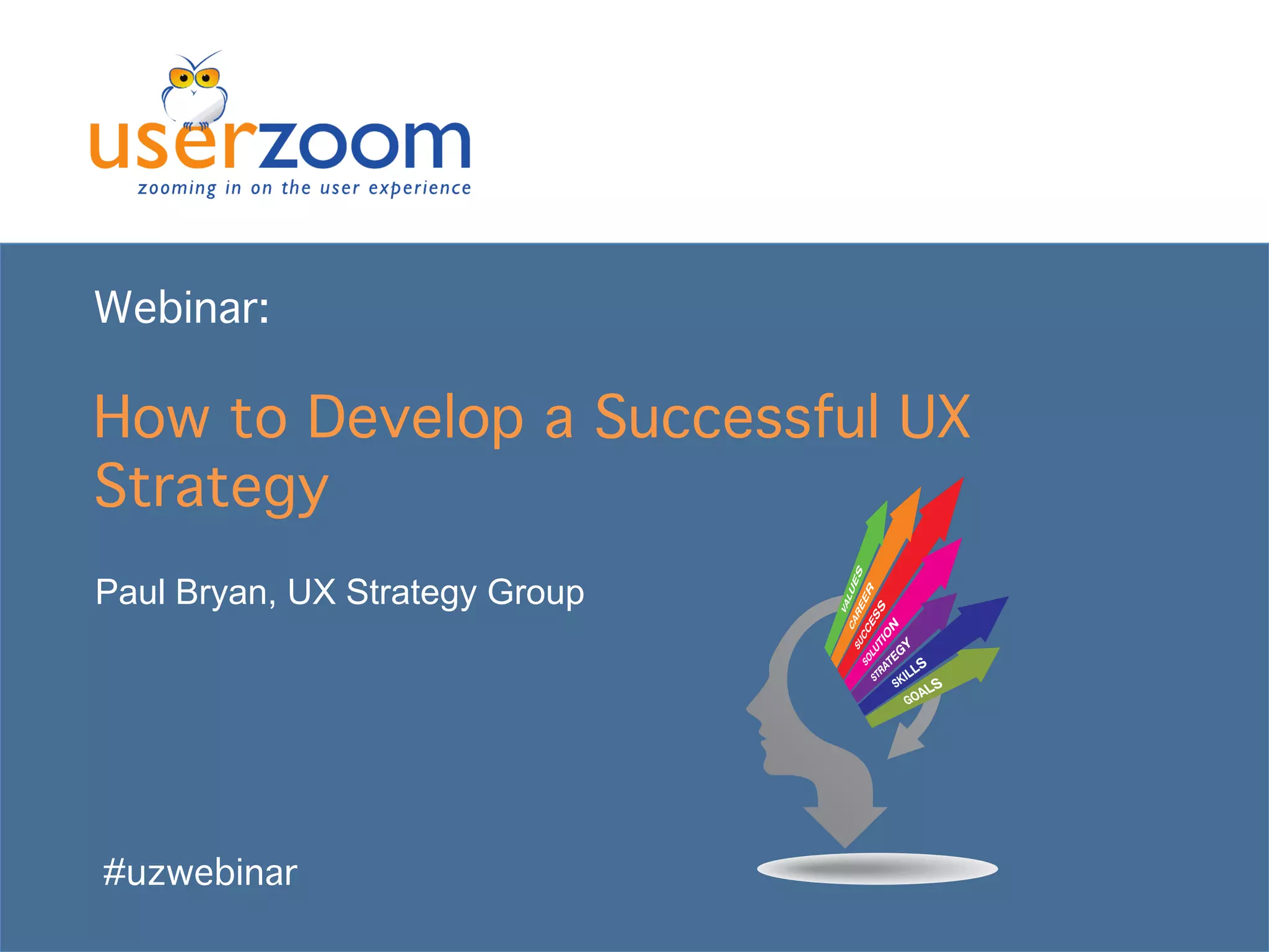 The webinar discusses the importance of developing a successful UX strategy, presented by Paul Bryan of UX Strategy Group and co-hosted by Alfonso de la Nuez from UserZoom. Key topics include aligning UX design with business strategy, understanding customer data, and creating effective experience modeling and behavioral segmentation. The session emphasizes the necessity of a comprehensive UX strategy that serves as a guiding framework for user experience design towards achieving business goals.