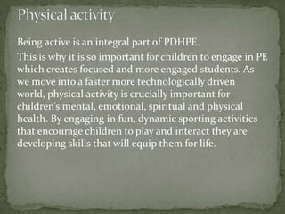 PDHPE (Personal Development, Health and Physical Education) provides many benefits to students. It encourages physical activity, healthy eating, and educates students about puberty, which promotes better mental, emotional, physical and spiritual health. Through fun activities, PDHPE develops important life skills in students and motivates them to choose nutritious food and stay active outside of school. The goal is for students to see the value in lifelong healthy behaviors.