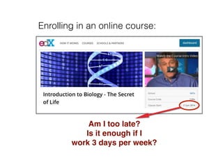 Predictor.com uses data from 15 online courses with 500,000 students to build a predictive model using quadratic discriminant analysis that can determine if a student will complete a course with an F1 score of 86%, precision of 84%, and recall of 88%. The model found that factors like time spent, number of days worked, time lag between activities, gender, education level, country, and age were the most relevant predictors of student success. The site then uses this model to provide course recommendations personalized for each user based on their characteristics and the transition patterns of previous students.