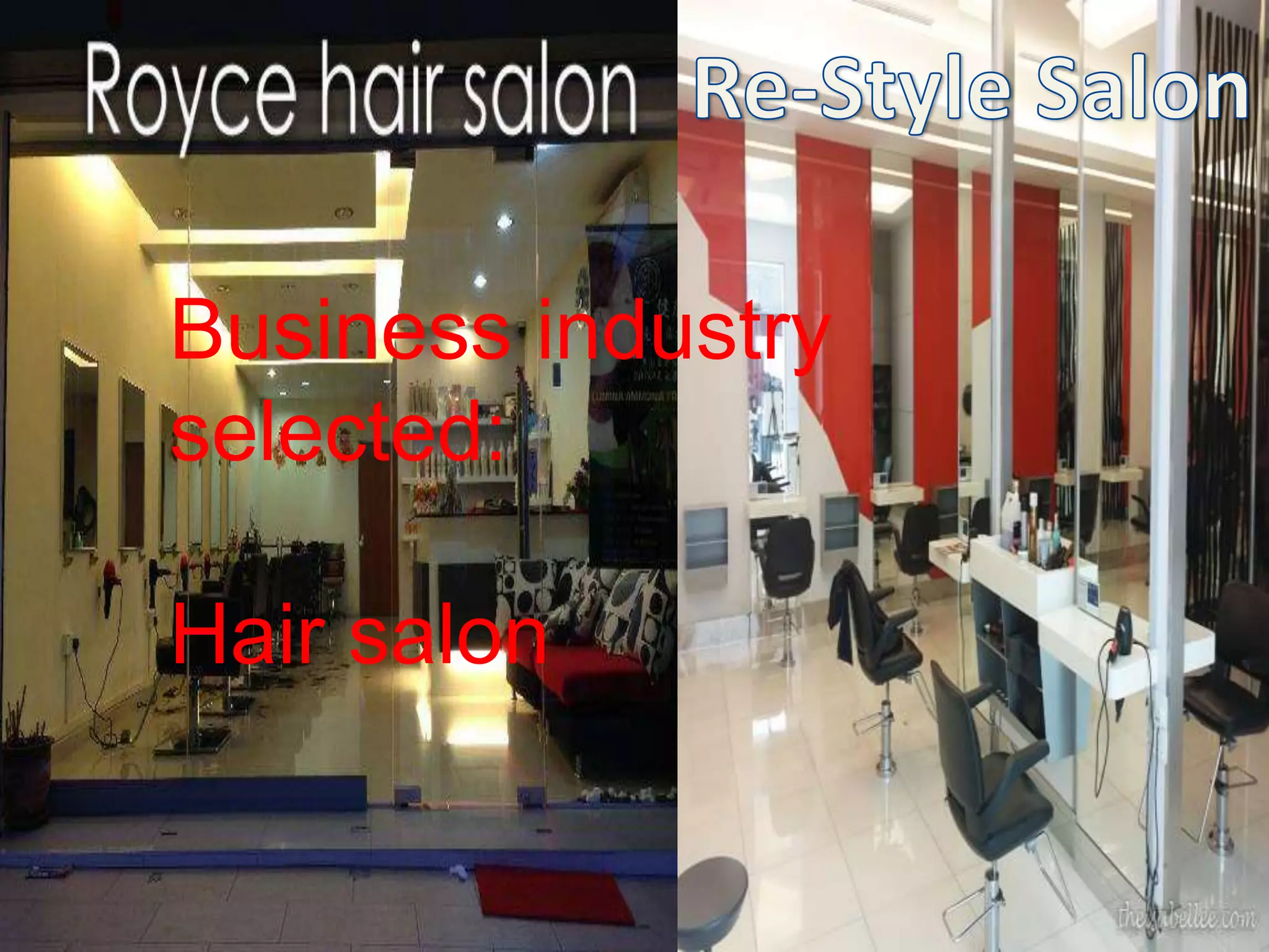 The document compares two hair salons: Royce Hair Salon, established in 2012 in Seremban, and Restyle Hair Salon, founded in 2009 in Syopz Mall. Royce focuses on affordable services in a less busy area, while Restyle targets students in a strategic location and has a well-known parent company. Recommendations for Royce include improving location and service variety, while Restyle is suggested to adopt a rebooking system.