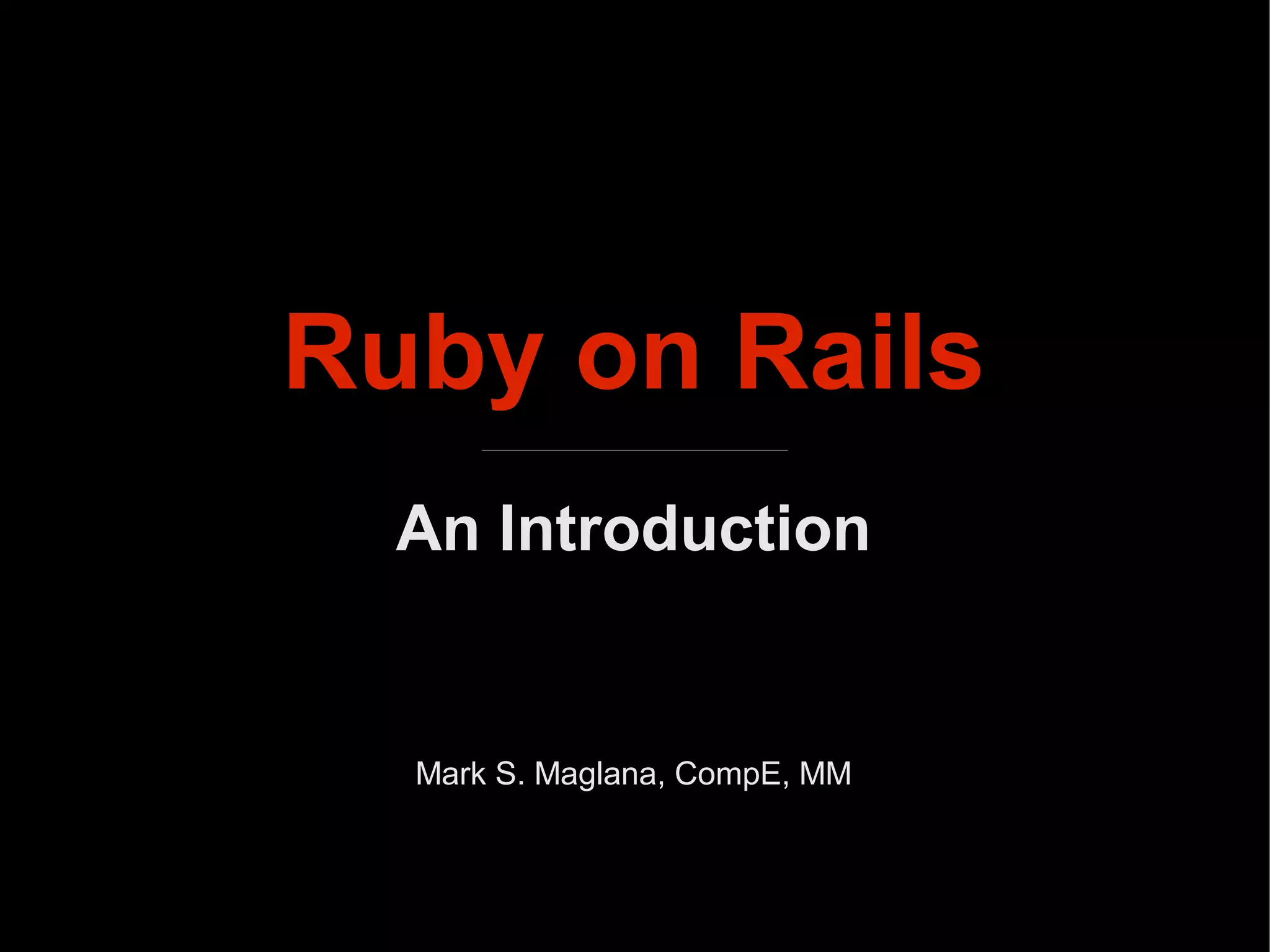 The document provides an introduction to Ruby on Rails, a web application framework built using the Ruby programming language. It discusses Ruby's object-oriented nature and conventions. Rails uses the MVC pattern and ActiveRecord pattern. Rails allows developers to build web apps faster by automatically generating the scaffolding for database access, controllers and views. The document recommends additional resources for learning more about Ruby and Rails.
