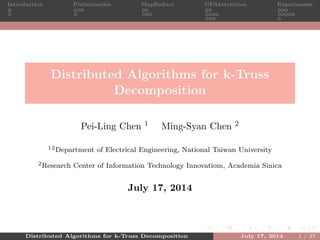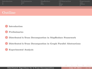 This document presents distributed algorithms for k-truss decomposition of large graphs. It begins with introducing the problem of k-truss decomposition and definitions. It then describes how k-truss decomposition can be performed using traditional sequential algorithms. It proposes two distributed algorithms: MRTruss, which uses MapReduce but has limitations; and i-MRTruss, an improved version that aims to address the issues with MRTruss. The document outlines the different sections that will evaluate these distributed algorithms and experimentally analyze their performance.