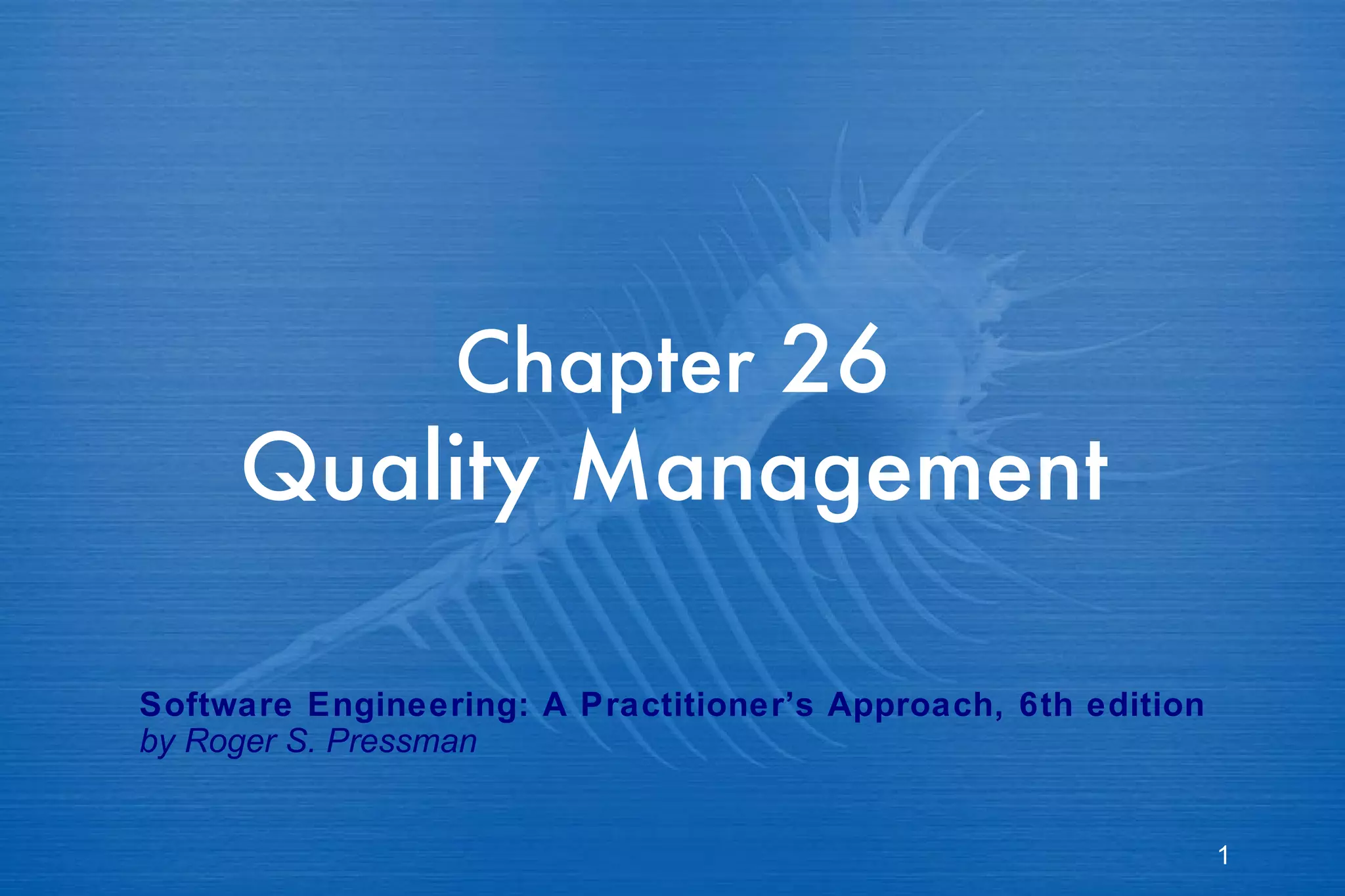 This document summarizes key aspects of quality management and software engineering based on a textbook. It discusses definitions of software quality, types of quality (design and conformance), the costs of quality, software quality assurance techniques like reviews and inspections, roles of a software quality assurance group, metrics for reviews, standards like ISO 9001, change management, software configuration management, and baselines.