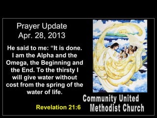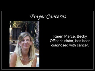 Karen Pierce, the sister of church member Becky Officer, has been diagnosed with cancer and needs prayers. Joe Prezel is recovering from a recent fall and broken ribs and also needs prayers. Elaine Matthews is lonely at home and needs visitors. The congregation and members whose health is keeping them away also need continued prayers.