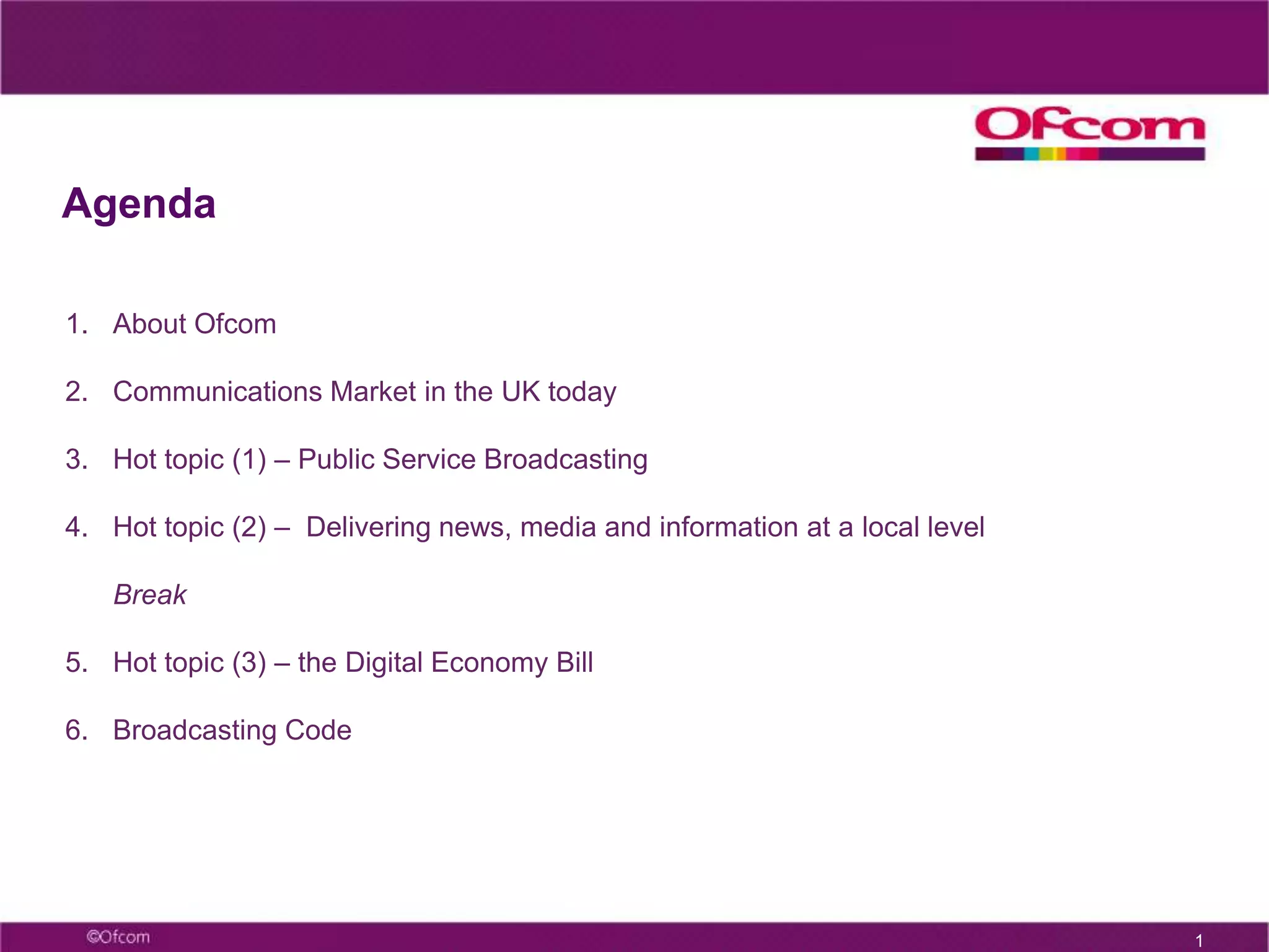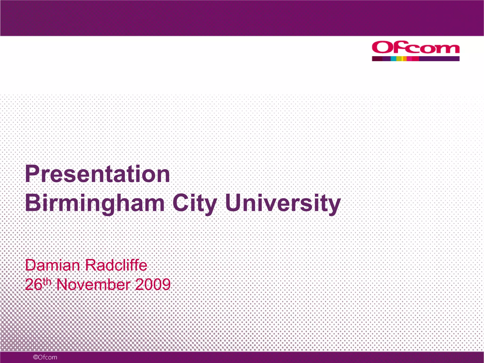The document summarizes key points from a presentation given by Damian Radcliffe at Birmingham City University on November 26, 2009. The presentation covered Ofcom's role as the UK communications regulator, the state of the communications market, issues around public service broadcasting, local media, and the Digital Economy Bill. It provided an overview of Ofcom's duties and focus areas, trends in digital technologies, challenges facing public service broadcasters, and the goals and main elements of the Digital Economy Bill.