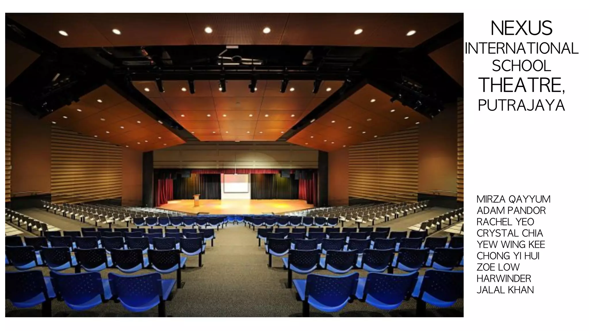 The Nexus International School Theatre located in Putrajaya, Malaysia was constructed in 2008 and seats 580 people. It uses various acoustic treatments like carpeting, drapery, cork and rock wool panels, and a sloped floor and ceiling reflectors to control reverberation. Based on measurements, the theatre's reverberation time of 0.92 seconds makes it suitable for speech but less so for music performances. Recommendations include reducing absorbent materials, maintaining equipment to reduce noise, and replacing aging acoustic panels.