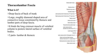 This document provides information on the thoracolumbar fascia, lumbar plexus, and back muscles. It describes the thoracolumbar fascia as a large sheet of connective tissue made of thoracic and lumbar parts that binds muscles to the spinal column. It also details the layers, attachments and clinical correlations of the lumbar fascia. Regarding the lumbar plexus, it lists the nerves that emerge from the lateral side of the psoas major muscle. Finally, it outlines the origins, insertions, innervations and actions of four back muscles - psoas major, psoas minor, iliacus and quadratus lumborum.