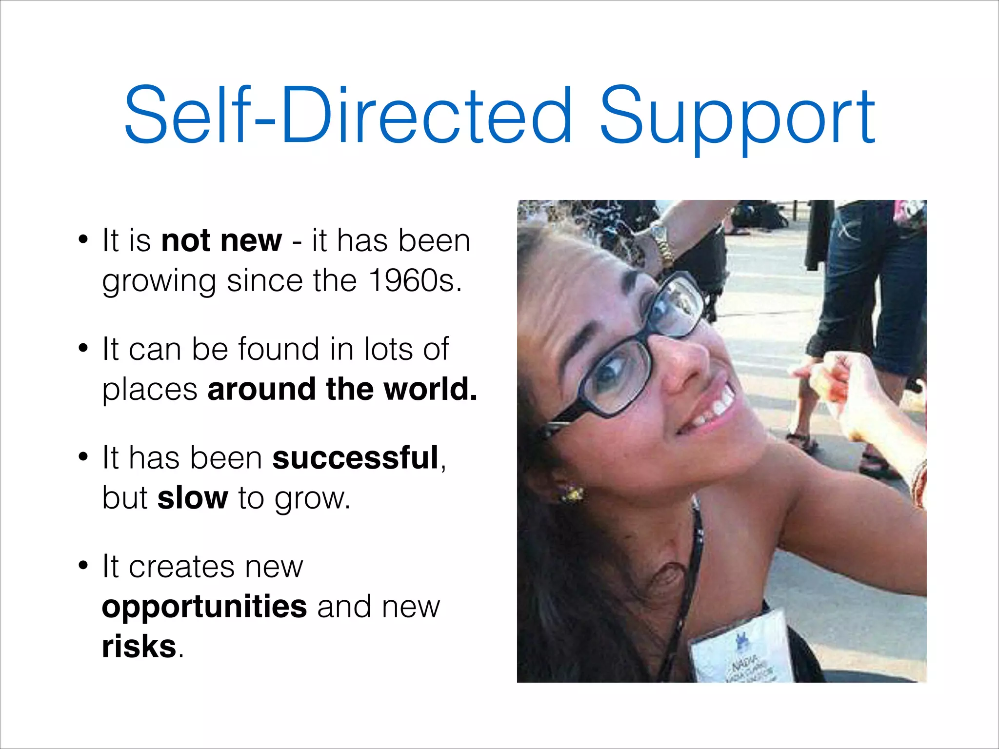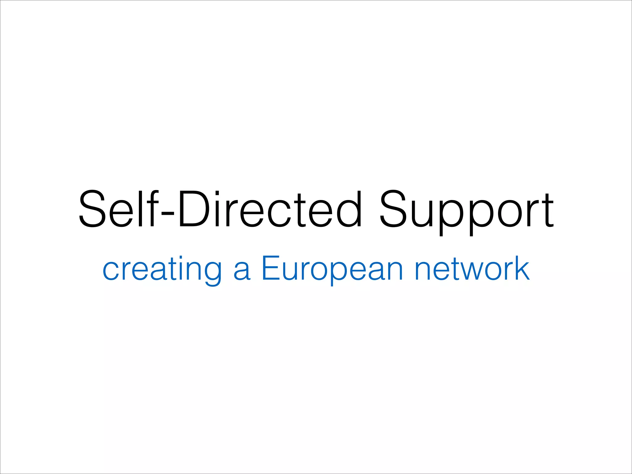 This document outlines the concept of self-directed support, which gives individuals more control over their support and assistance. It discusses the history and principles of self-directed support, including the importance of individual rights, flexibility, clarity, and community involvement. Research shows self-directed support can improve people's lives while potentially reducing costs. The document proposes creating a European network to promote self-directed support principles and share best practices between countries in order to strengthen individual rights and inclusion.