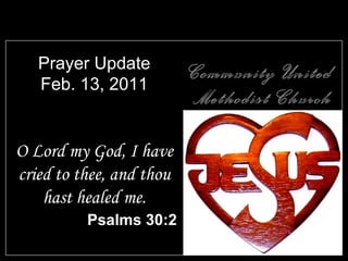 The prayer concerns update from Community United Methodist Church includes requests for Deb Manley and Bud Urban who had knee replacement surgery, Patrick Riddle who was hospitalized for breathing trouble and may need a heart transplant, Jim Smith who is undergoing daily radiation treatments, and Frankie Rebiskie whose defibrillator was repaired after she collapsed. The update also gives praise for an upcoming mission trip to Guatemala and provides continued prayers for several individuals. Sunday school is studying Exodus and the youth group is having a lasagna lunch fundraiser after service.