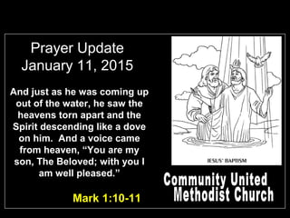 This prayer update from January 11, 2015 includes Bible verses from Mark about Jesus's baptism. It lists several members of the congregation in need of prayers for health or other concerns, as well as members of the armed services. The update also announces upcoming church events, including meetings, a Mardi Gras dinner, and Boy Scout Sunday.