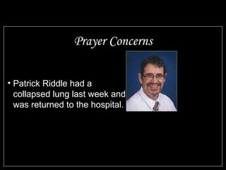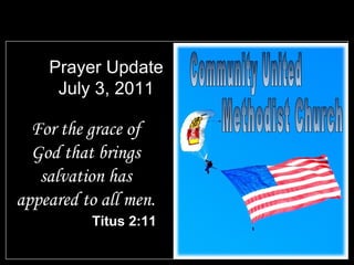 The document provides prayer concerns and praises for members of the Community United Methodist Church community. It includes updates on Patrick Riddle who had a collapsed lung and was hospitalized, and asks for continued prayers for victims of disasters in Japan and the US. It provides praise that Marion Crail has returned home from knee surgery and that Mary Huckaby's sugar levels are under control. The document also announces upcoming church events, including a membership meeting, pastor's vacation, committee meetings, Habitat for Humanity lunches, a potluck, medical outreach, and a camp at Lodestar.