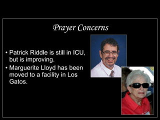 The document provides a prayer update and announcements for a church. It includes prayer concerns for several individuals, a request to pray for victims of natural disasters and military members/families. It announces upcoming seminars on medical decisions and disaster preparedness. It also lists Bible study groups, a request for old electronics to be donated, and upcoming church camp and vacation Bible school events.