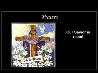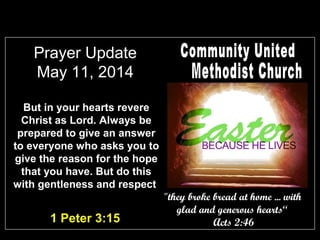 This prayer update document provides information on upcoming events at a church and requests for prayers. It contains the following: 1) A Bible verse calling Christians to always be prepared to explain their faith with gentleness and respect. 2) Announcements of mothers being praised and prayers requested for several people including Elaine Matthews and Carrie Davis. 3) An invitation for a mission trip from May 23-30 to assemble relief kits in Salt Lake City with the United Methodist Committee on Relief (UMCOR).