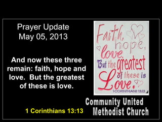 Karen Pierce, Becky Officer's sister, has been diagnosed with cancer and several others including Joe Prezel, Elaine Matthews, Byron Crail, and others need prayers for health issues or loneliness. The prayer update document also announces upcoming events at their church including a Mother's Day breakfast, MAP meeting, Methodist Day in the park, and BBQ dinner fundraiser.