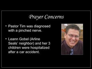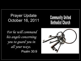 The document provides updates and announcements for Community United Methodist Church. It lists prayer concerns for church members who are ill or in the hospital. It announces an all church work day to clean the church and several upcoming fundraising and mission events, including a fall extravaganza, a mission trip to Guatemala, and a combined worship service with another church. It also lists regular small group Bible study and meeting times.