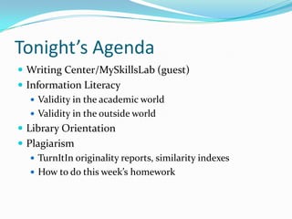 This document outlines the agenda for a meeting that will discuss information literacy. It will cover how to evaluate the credibility of sources, both in academic and real world contexts. Specific topics will include how to identify credible information, structures that control information, clues within sources, cross-referencing multiple sources, and challenges determining credibility online. The academic world uses credentials, affiliations, prestige and peer review to judge credibility. A library orientation will also be provided.