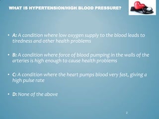 This document is a quiz about hypertension (high blood pressure). It contains 20 multiple choice questions that test understanding of what hypertension is, normal blood pressure values, risk factors, symptoms, health problems associated with uncontrolled hypertension, lifestyle changes and medications for treatment. The key points covered are: