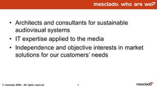 This document discusses the Interoperable Master Format (IMF) standard. It provides an overview of IMF and its goals of standardizing master formats to replace proprietary formats. It describes how IMF packages can include different versions for artistic and technical purposes. Examples are given of products and services that support IMF, including hardware and software for generating and manipulating IMF masters. Upcoming events on IMF and related topics hosted by mesclado are also listed.