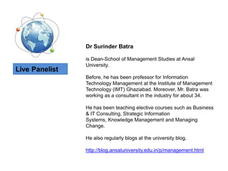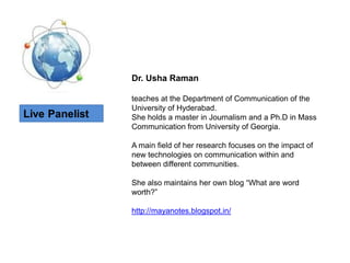 The document summarizes biographies of three professionals: Dr. Usha Raman teaches mass communication at the University of Hyderabad and blogs about the impact of new technologies on communication. Dr Surinder Batra is Dean of the School of Management Studies at Ansal University and blogs on the university site, having previously taught information technology management. Mr. Madhan Muthu works for the Knowledge Sharing and Innovation department at ICRISAT, dealing with open science and has authored a report on open access to scholarly literature in India.