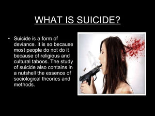 The document discusses Durkheim's sociological theories on suicide. Durkheim established that suicide rates are higher among certain demographic groups, such as men, singles, the unmarried, Protestants. He identified four main types of suicide: egoistic, altruistic, anomic, and fatalistic. The document then discusses reasons for and statistics on suicide in Pakistan, ways it is committed, effects on survivors, and strategies for prevention.