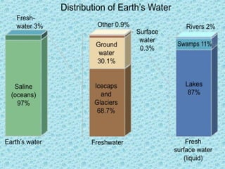 Water resources include sources of water that are useful for human purposes like agriculture, industry, households, recreation and the environment. Nearly all human uses require fresh water, but only 3% of the Earth's water is fresh, and over two-thirds of that is frozen in glaciers and polar ice caps. The remaining fresh water is found as groundwater or above ground. Increasing water scarcity is caused by overuse, population growth, industrialization, deforestation, and mismanagement of water resources. Multi-purpose river projects provide irrigation water while also generating hydropower, enabling navigation, and supporting fisheries to help address increasing scarcity. Rainwater harvesting and water conservation methods like reducing waste are important for preserving
