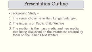 This document outlines a research study that examines the role of mass media and new media in creating awareness of public child welfare issues among residents of Hulu Langat, Selangor, Malaysia. The study involves surveying residents and students about their exposure to media coverage of child welfare issues and understanding of related topics. The research aims to determine the level of awareness and how it differs based on demographics. It also seeks to understand how media exposure impacts knowledge of child welfare issues.