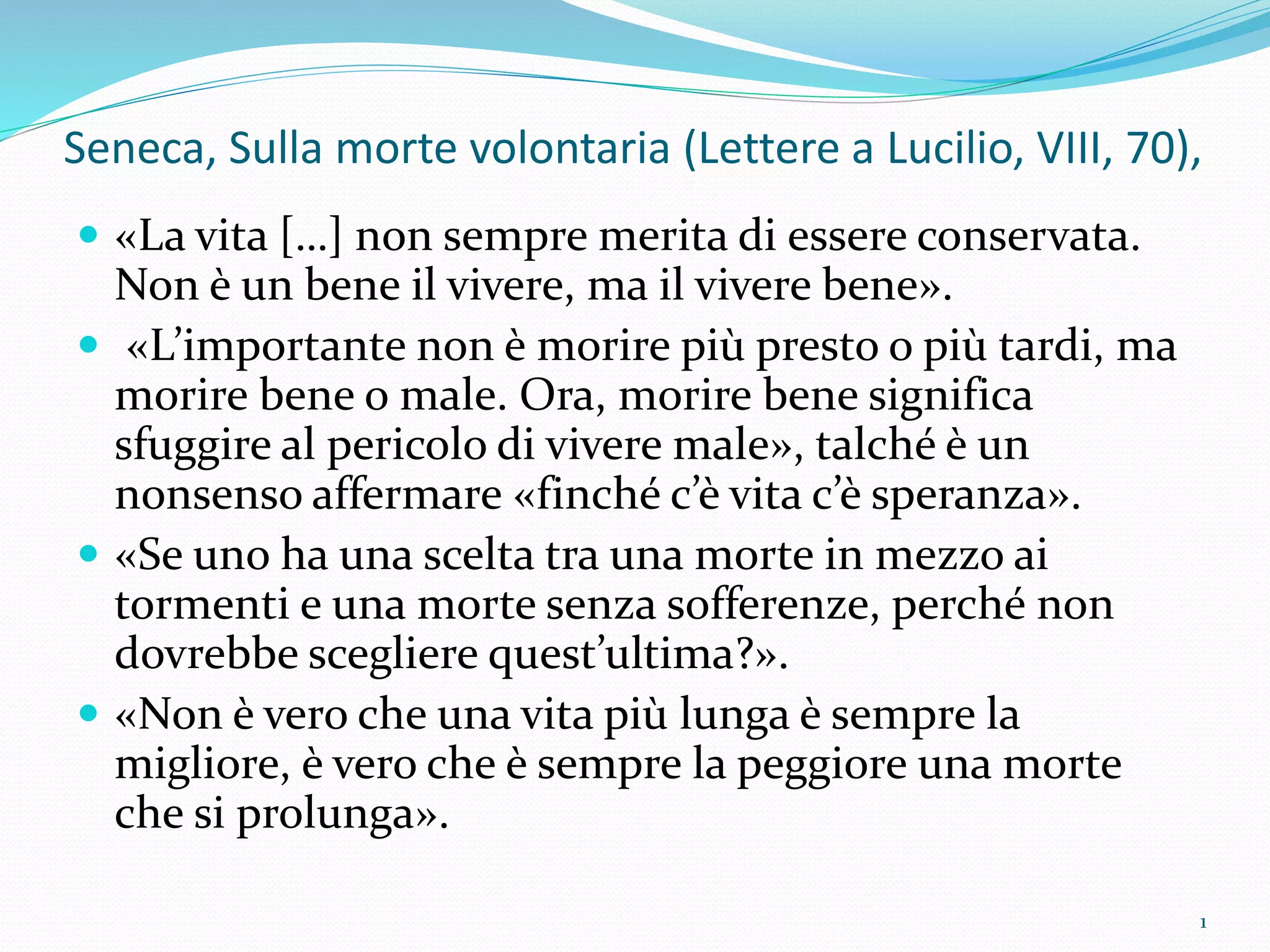 Il documento esamina il tema dell'eutanasia e del diritto a una morte dignitosa, analizzando diverse posizioni filosofiche e religiose, a partire dalle riflessioni di Seneca fino a leggi attuali in Italia. Si evidenzia la differenza tra la vita e la sofferenza come dono di Dio, sostenendo che l'eutanasia possa essere un atto di resistenza contro il male e non di ribellione a Dio. In particolare, vengono presentate proposte legislative che pongono attenzione sull'autonomia del paziente e il rispetto della sua dignità nella scelta di interrompere trattamenti medici in caso di sofferenza insormontabile.